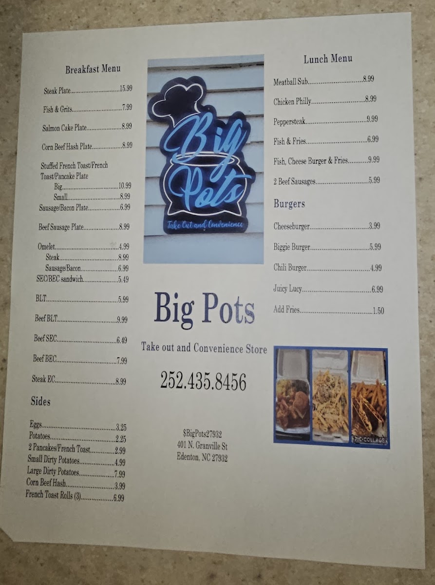 Whether you’re grabbing breakfast on a lazy Sunday morning or enjoying a casual lunch with friends, Big Pots promises a dining experience that warms both the belly and the heart. The inviting environment combined with delicious, homestyle cooking makes this Edenton gem a must-visit for food lovers. So grab your family and friends, head over to Big Pots, and savor the goodness awaiting you!